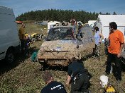 Startovní kopec jsem sbíhal s Ladou, odstartovali jsme jako nejrychlejší velké auto a za buginkou a malým KB. To se brzy utopilo v bahně a tak jsem si sám diktoval tempo. Soupeři byli hodně daleko a tak jsem mohl jet v klidu. No ale asi v půlce okruhu jsem stejně jako v loni udělal na kaluži dětskou chybu a skončil v křoví a polovina startovního pole mě předjela. I když jsem chtěl jet udržovací jízdu, musel jsem zrychlit a po 2. kole už jsem byl druhý a v 7. kole už jsem vedl celé závodní pole. První místo jsme si udrželi i když jsme 2x preventivně měnili polybuše v přední a pak v zadní panhardce, řešili dva defekty a na rozdíl od soupeřů střídali už po 2 hodinách. Když se nám ve 2 hodiny v noci roztrhl kardan, dostal se do čela Valtr. I on se potýkal s drobnými technickými problémy, ale oab jsme měli dostatečná náskok na třetího a další soupeře. Když se nám dopoledne pokazila kardanka řízení, zvýšil Valtr náskok na 3 kola. Čtyři hodiny před koncem střídal Honza s Ladou a protože Valtr kvůli technice zpomalil, bylo rozhodnuto, že dají celé 4 hodiny a nebudeme ztrácet střídáním. Podařilo se jim stáhnout na rozdíl 1 kola a tak se muselo rozhodnout v posledních 20 minutách. Pak se na nás po letech usmálo štěstí (nebo smůla potkala Valtra?) a bezchybně fungující Brouček předjel technickou závadou stojící žlutý Jeep Valtra. Honza mohl s velkou slávou dojet na 1.místě v kategorii Auta nad 2000 ccm a celý tým mohl slavit. SUPER.