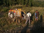 Startovní kopec jsem sbíhal s Ladou, odstartovali jsme jako nejrychlejší velké auto a za buginkou a malým KB. To se brzy utopilo v bahně a tak jsem si sám diktoval tempo. Soupeři byli hodně daleko a tak jsem mohl jet v klidu. No ale asi v půlce okruhu jsem stejně jako v loni udělal na kaluži dětskou chybu a skončil v křoví a polovina startovního pole mě předjela. I když jsem chtěl jet udržovací jízdu, musel jsem zrychlit a po 2. kole už jsem byl druhý a v 7. kole už jsem vedl celé závodní pole. První místo jsme si udrželi i když jsme 2x preventivně měnili polybuše v přední a pak v zadní panhardce, řešili dva defekty a na rozdíl od soupeřů střídali už po 2 hodinách. Když se nám ve 2 hodiny v noci roztrhl kardan, dostal se do čela Valtr. I on se potýkal s drobnými technickými problémy, ale oab jsme měli dostatečná náskok na třetího a další soupeře. Když se nám dopoledne pokazila kardanka řízení, zvýšil Valtr náskok na 3 kola. Čtyři hodiny před koncem střídal Honza s Ladou a protože Valtr kvůli technice zpomalil, bylo rozhodnuto, že dají celé 4 hodiny a nebudeme ztrácet střídáním. Podařilo se jim stáhnout na rozdíl 1 kola a tak se muselo rozhodnout v posledních 20 minutách. Pak se na nás po letech usmálo štěstí (nebo smůla potkala Valtra?) a bezchybně fungující Brouček předjel technickou závadou stojící žlutý Jeep Valtra. Honza mohl s velkou slávou dojet na 1.místě v kategorii Auta nad 2000 ccm a celý tým mohl slavit. SUPER.
