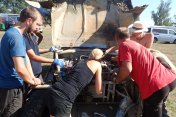 Startovní kopec jsem sbíhal s Ladou, odstartovali jsme jako nejrychlejší velké auto a za buginkou a malým KB. To se brzy utopilo v bahně a tak jsem si sám diktoval tempo. Soupeři byli hodně daleko a tak jsem mohl jet v klidu. No ale asi v půlce okruhu jsem stejně jako v loni udělal na kaluži dětskou chybu a skončil v křoví a polovina startovního pole mě předjela. I když jsem chtěl jet udržovací jízdu, musel jsem zrychlit a po 2. kole už jsem byl druhý a v 7. kole už jsem vedl celé závodní pole. První místo jsme si udrželi i když jsme 2x preventivně měnili polybuše v přední a pak v zadní panhardce, řešili dva defekty a na rozdíl od soupeřů střídali už po 2 hodinách. Když se nám ve 2 hodiny v noci roztrhl kardan, dostal se do čela Valtr. I on se potýkal s drobnými technickými problémy, ale oab jsme měli dostatečná náskok na třetího a další soupeře. Když se nám dopoledne pokazila kardanka řízení, zvýšil Valtr náskok na 3 kola. Čtyři hodiny před koncem střídal Honza s Ladou a protože Valtr kvůli technice zpomalil, bylo rozhodnuto, že dají celé 4 hodiny a nebudeme ztrácet střídáním. Podařilo se jim stáhnout na rozdíl 1 kola a tak se muselo rozhodnout v posledních 20 minutách. Pak se na nás po letech usmálo štěstí (nebo smůla potkala Valtra?) a bezchybně fungující Brouček předjel technickou závadou stojící žlutý Jeep Valtra. Honza mohl s velkou slávou dojet na 1.místě v kategorii Auta nad 2000 ccm a celý tým mohl slavit. SUPER.