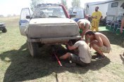 Startovní kopec jsem sbíhal s Ladou, odstartovali jsme jako nejrychlejší velké auto a za buginkou a malým KB. To se brzy utopilo v bahně a tak jsem si sám diktoval tempo. Soupeři byli hodně daleko a tak jsem mohl jet v klidu. No ale asi v půlce okruhu jsem stejně jako v loni udělal na kaluži dětskou chybu a skončil v křoví a polovina startovního pole mě předjela. I když jsem chtěl jet udržovací jízdu, musel jsem zrychlit a po 2. kole už jsem byl druhý a v 7. kole už jsem vedl celé závodní pole. První místo jsme si udrželi i když jsme 2x preventivně měnili polybuše v přední a pak v zadní panhardce, řešili dva defekty a na rozdíl od soupeřů střídali už po 2 hodinách. Když se nám ve 2 hodiny v noci roztrhl kardan, dostal se do čela Valtr. I on se potýkal s drobnými technickými problémy, ale oab jsme měli dostatečná náskok na třetího a další soupeře. Když se nám dopoledne pokazila kardanka řízení, zvýšil Valtr náskok na 3 kola. Čtyři hodiny před koncem střídal Honza s Ladou a protože Valtr kvůli technice zpomalil, bylo rozhodnuto, že dají celé 4 hodiny a nebudeme ztrácet střídáním. Podařilo se jim stáhnout na rozdíl 1 kola a tak se muselo rozhodnout v posledních 20 minutách. Pak se na nás po letech usmálo štěstí (nebo smůla potkala Valtra?) a bezchybně fungující Brouček předjel technickou závadou stojící žlutý Jeep Valtra. Honza mohl s velkou slávou dojet na 1.místě v kategorii Auta nad 2000 ccm a celý tým mohl slavit. SUPER.