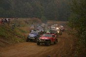 Startovní kopec jsem sbíhal s Ladou, odstartovali jsme jako nejrychlejší velké auto a za buginkou a malým KB. To se brzy utopilo v bahně a tak jsem si sám diktoval tempo. Soupeři byli hodně daleko a tak jsem mohl jet v klidu. No ale asi v půlce okruhu jsem stejně jako v loni udělal na kaluži dětskou chybu a skončil v křoví a polovina startovního pole mě předjela. I když jsem chtěl jet udržovací jízdu, musel jsem zrychlit a po 2. kole už jsem byl druhý a v 7. kole už jsem vedl celé závodní pole. První místo jsme si udrželi i když jsme 2x preventivně měnili polybuše v přední a pak v zadní panhardce, řešili dva defekty a na rozdíl od soupeřů střídali už po 2 hodinách. Když se nám ve 2 hodiny v noci roztrhl kardan, dostal se do čela Valtr. I on se potýkal s drobnými technickými problémy, ale oab jsme měli dostatečná náskok na třetího a další soupeře. Když se nám dopoledne pokazila kardanka řízení, zvýšil Valtr náskok na 3 kola. Čtyři hodiny před koncem střídal Honza s Ladou a protože Valtr kvůli technice zpomalil, bylo rozhodnuto, že dají celé 4 hodiny a nebudeme ztrácet střídáním. Podařilo se jim stáhnout na rozdíl 1 kola a tak se muselo rozhodnout v posledních 20 minutách. Pak se na nás po letech usmálo štěstí (nebo smůla potkala Valtra?) a bezchybně fungující Brouček předjel technickou závadou stojící žlutý Jeep Valtra. Honza mohl s velkou slávou dojet na 1.místě v kategorii Auta nad 2000 ccm a celý tým mohl slavit. SUPER.