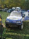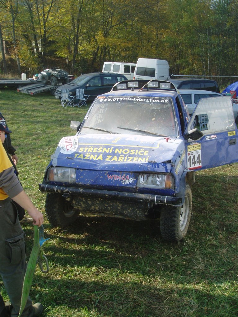 Startovní kopec jsem sbíhal s Ladou, odstartovali jsme jako nejrychlejší velké auto a za buginkou a malým KB. To se brzy utopilo v bahně a tak jsem si sám diktoval tempo. Soupeři byli hodně daleko a tak jsem mohl jet v klidu. No ale asi v půlce okruhu jsem stejně jako v loni udělal na kaluži dětskou chybu a skončil v křoví a polovina startovního pole mě předjela. I když jsem chtěl jet udržovací jízdu, musel jsem zrychlit a po 2. kole už jsem byl druhý a v 7. kole už jsem vedl celé závodní pole. První místo jsme si udrželi i když jsme 2x preventivně měnili polybuše v přední a pak v zadní panhardce, řešili dva defekty a na rozdíl od soupeřů střídali už po 2 hodinách. Když se nám ve 2 hodiny v noci roztrhl kardan, dostal se do čela Valtr. I on se potýkal s drobnými technickými problémy, ale oab jsme měli dostatečná náskok na třetího a další soupeře. Když se nám dopoledne pokazila kardanka řízení, zvýšil Valtr náskok na 3 kola. Čtyři hodiny před koncem střídal Honza s Ladou a protože Valtr kvůli technice zpomalil, bylo rozhodnuto, že dají celé 4 hodiny a nebudeme ztrácet střídáním. Podařilo se jim stáhnout na rozdíl 1 kola a tak se muselo rozhodnout v posledních 20 minutách. Pak se na nás po letech usmálo štěstí (nebo smůla potkala Valtra?) a bezchybně fungující Brouček předjel technickou závadou stojící žlutý Jeep Valtra. Honza mohl s velkou slávou dojet na 1.místě v kategorii Auta nad 2000 ccm a celý tým mohl slavit. SUPER.