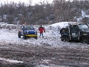 Startovní kopec jsem sbíhal s Ladou, odstartovali jsme jako nejrychlejší velké auto a za buginkou a malým KB. To se brzy utopilo v bahně a tak jsem si sám diktoval tempo. Soupeři byli hodně daleko a tak jsem mohl jet v klidu. No ale asi v půlce okruhu jsem stejně jako v loni udělal na kaluži dětskou chybu a skončil v křoví a polovina startovního pole mě předjela. I když jsem chtěl jet udržovací jízdu, musel jsem zrychlit a po 2. kole už jsem byl druhý a v 7. kole už jsem vedl celé závodní pole. První místo jsme si udrželi i když jsme 2x preventivně měnili polybuše v přední a pak v zadní panhardce, řešili dva defekty a na rozdíl od soupeřů střídali už po 2 hodinách. Když se nám ve 2 hodiny v noci roztrhl kardan, dostal se do čela Valtr. I on se potýkal s drobnými technickými problémy, ale oab jsme měli dostatečná náskok na třetího a další soupeře. Když se nám dopoledne pokazila kardanka řízení, zvýšil Valtr náskok na 3 kola. Čtyři hodiny před koncem střídal Honza s Ladou a protože Valtr kvůli technice zpomalil, bylo rozhodnuto, že dají celé 4 hodiny a nebudeme ztrácet střídáním. Podařilo se jim stáhnout na rozdíl 1 kola a tak se muselo rozhodnout v posledních 20 minutách. Pak se na nás po letech usmálo štěstí (nebo smůla potkala Valtra?) a bezchybně fungující Brouček předjel technickou závadou stojící žlutý Jeep Valtra. Honza mohl s velkou slávou dojet na 1.místě v kategorii Auta nad 2000 ccm a celý tým mohl slavit. SUPER.